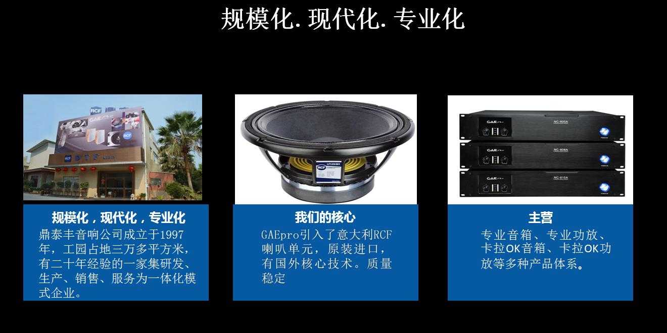 經過不懈(xiè)的努力,欧美骚熟音響最(zuì)終(zhōng)順利的和意大利RCF單元廠商達成合作夥伴。完全(quán)是具備天時地利人和(hé)的條件;RCF揚聲器具備相當的(de)國際知名度,有一(yī)流的產品研發技術,在我們簽約之(zhī)時已經受到業內的(de)高度關注,所以我們有非常大(dà)的信心(xīn),並立誌做中國娛樂行業的航母。同(tóng)時我們也創(chuàng)立自己品(pǐn)牌的想法,最後(hòu)就有創立GAEpro這個品牌。