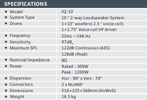 •IQ-10音箱是一款高輸出的內置(zhì)二分頻係(xì)統音響,它的(de)設計是基於現代聲學的最新理念和理論為基礎。整個係列采用歐洲高素(sù)質單元以配合整體的聲學箱體(tǐ)設計(jì)。